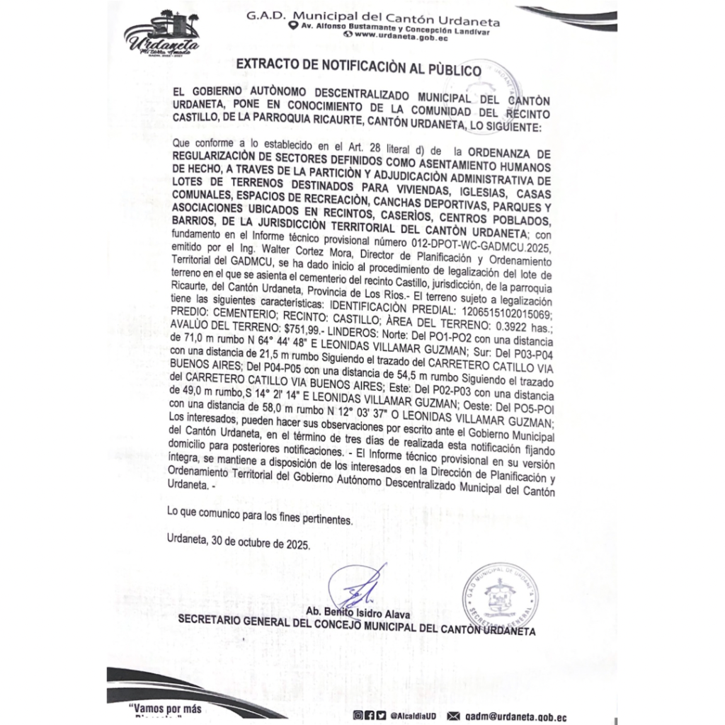 EXTRACTO DE NOTIFICACIÓN AL PÚBLICO DE LA COMUNIDAD DEL RECINTO CASTILLO